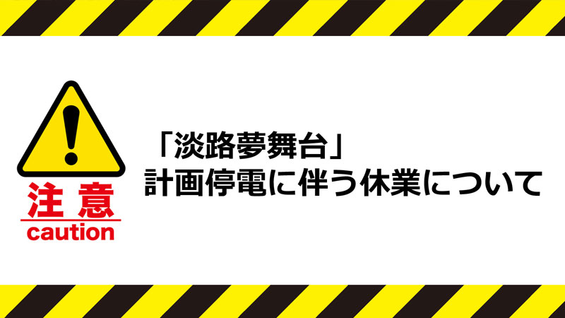 【重要】2026年1月 計画停電に伴う休業について2026年1月15日(木)、16日(金)と特別高圧受変電設備更新のため、淡路夢舞台各施設停電となります。停電に伴う休業期間は以下の通りです。なお、作業状況により変更になる場合もございます。