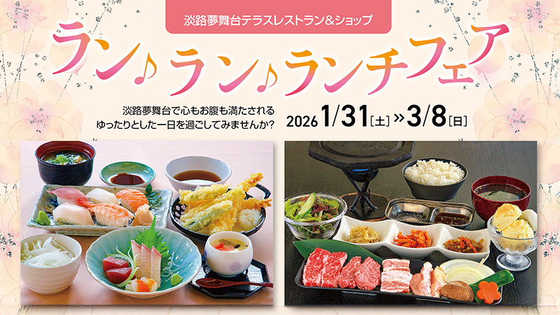 あわじグリーン館「オーキッドフェスティバル」に合わせ、展望テラス レストラン&ショップでは“ランランランチフェア”を開催。とっておきのメニューをご用意して、みなさまのお越しをお待ちしています。フェアの特典として、150円割引券のプレゼントも!! あったかい温室とこだわりの“食”をお楽しみください。