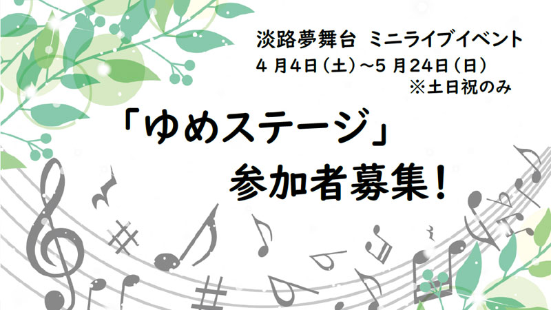 淡路夢舞台では、ミニライブイベント「ゆめステージ」にご参加いただけるみなさんを募集しています。淡路夢舞台の一画を自由にお使いいただける期間限定の「ゆめステージ」。音楽やダンス、ストリートパフォーマンスなど、日頃の練習の成果を披露してみませんか?